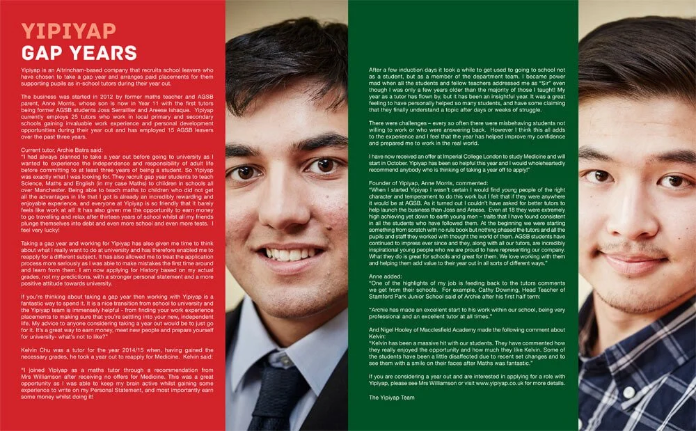 The business was started in 2012 by former maths teacher and AGSB parent, Anne Morris, whose son is now in Year 11 with the first tutors being former AGSB students Joss Serraillier and Areese Ishaque. Yipiyap currently employs 25 tutors who work in local primary and secondary schools gaining invaluable work experience and personal development opportunities during their year out and has employed 15 AGSB leavers over the past three years.